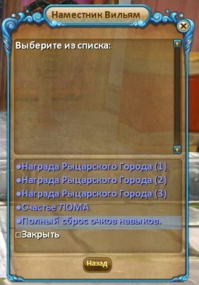 | Сброс навыков Сброс навыков позволяет заново распределить все полученные до вашего уровня очки навыков Возможность сброса предоставляется бесплатно 1 раз до 1 перерождения, 1 раз после и 1 раз после второго перерождения. Дальнейшие сбросы очков доступны после покупки специального предмета в магазине за реальные деньги (Амулет сброса - сбрасывает навыки только текущей ветки (Если вы оракул - сбросятся очки, потраченные на ветку оракула, но предыдущие ветки адепта, потрошителя и призывателя останутся нетронутыми) и Знак проклятья - сбрасываются все очки). 1. Идем в Рыцарский Город 2. Подходим к Наместнику Вильяму 3. Выбираем: Задания – Полный сброс очков навыков 4. После выполнения квеста у вас сбросятся все распределенные очки и вы сможете заново заполнить дерево навыков так, как вам хочется