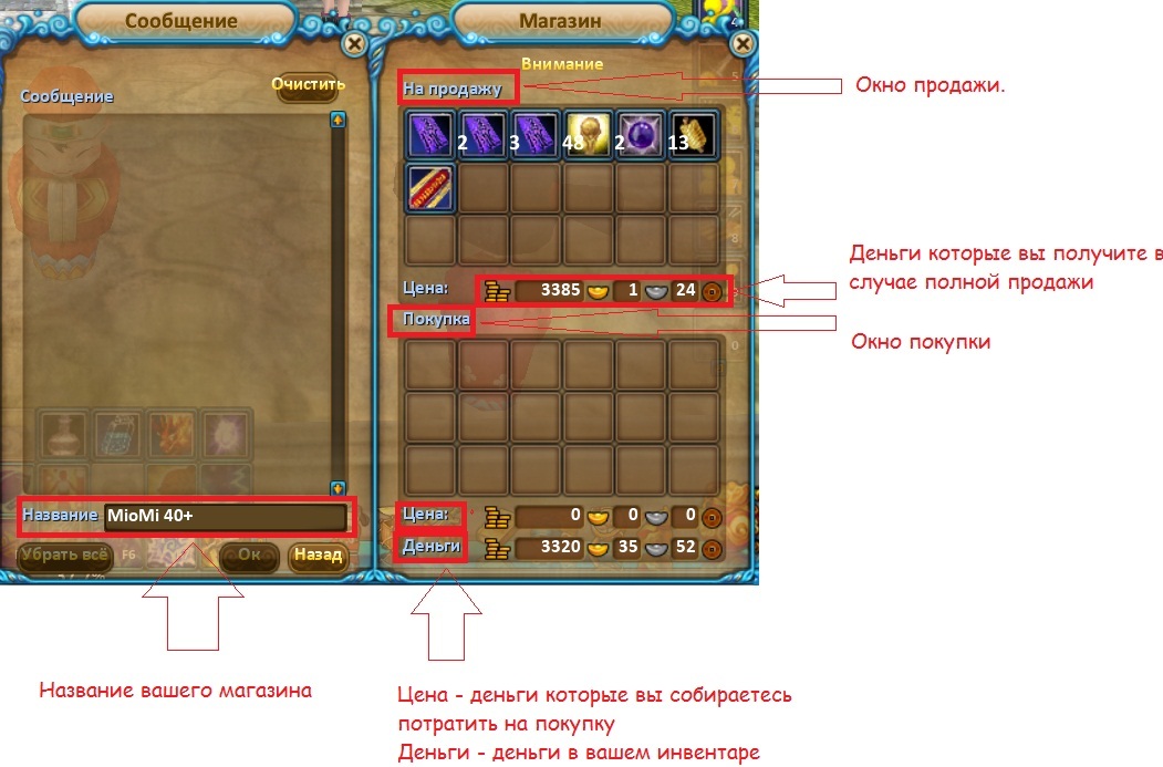 В открывшемся окне магазина, нужно: - Выставить предметы которые вы собираетесь продавать (1)