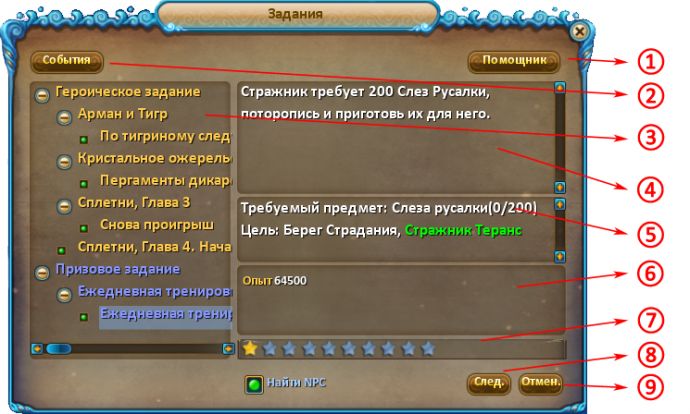 Внимание! Если при нажатии клавиши панель с заданиями не открывается, проверьте раскладку клавиатуры и отсутствие мигающего курсора для ввода текста в окне чата. 1. При нажатии на кнопку "Помощник" на основном интерфейсе игры появится панель с кратким описанием ваших заданий. 2. При нажатии кнопки "События" открывается "Всезнайка ЛОМА", в которой описаны все проходящие эвенты в игре, содержится помощь по заданиям на вашем уровне и много других интересных и полезных вещей. 3. Список ваших заданий. Внимание! Задания, помеченные желтым цветом - это основная сюжетная линия, которую необходимо выполнять для получения новых предметов, уровней и очков навыков. Так же к желтым заданиям относятся квесты "Сплетни", за них также дают много опыта, звание и питомца. 4. Окно с описанием квеста. Тут вы можете прочитать, в чем заключается ваша задача и получить справочную информацию по успешному выполнению задания. 5. Информация о местоположении ключевого места для завершения задания. 6. Информация о вознаграждении за выполнение задания. 7. Сложность выполняемого задания. (Чем больше звезд, тем сложнее задание и тем выше вознаграждение за его успешное выполнение). 8. Если задание вдруг не попало в список "Помощи", то при нажатии на эту кнопку оно добавится. 9. Если задание оказалось вам не по силам, либо вы не хотите его выполнять, нажмите на кнопку "Отмен."