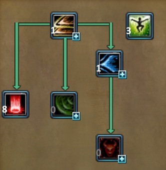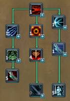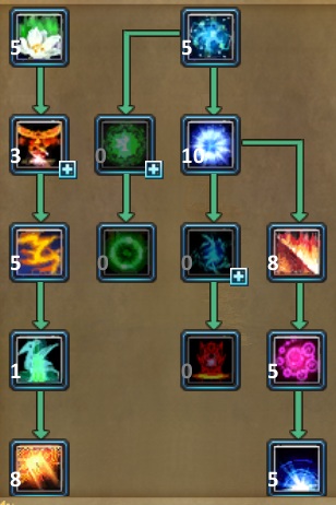 | [80] Райская Птица. Селф-баф умение, которое значительно увеличивает скорость передвижения персонажа на 15 секунд, а также снимает эффекты обездвиживания и замедления. (!) Не действует на стан (оглушение). (*) Крайне полезное для мобильности умение. [80] Тотем Старейшины. Селф-баф умение, которое временно позволяет восстанавливать здоровье за счет нанесения урона, однако количество максимально восстановленного здоровья ограничено. (*) Довольно спорное к прокачке умение. С одной стороны позволяет восстановить здоровье, что должно быть удобно в ПВП и иногда в ПВЕ. Однако, на практике, в ПВЕ гораздо удобнее пользоваться средствами лечения (потами и тд) и хилом приста. В ПВП из-за наличия большого количества других селф-бафов и различных способностей противника к блокированию урона умение также теряет свою практичность. [80] Небесный Тотем. Селф-баф умение, которое временно уменьшает получаемый персонажем урон. (*) Обязательно к прокачке, незаменимо в ПВП и ПВЕ. [100] Меч Судьбы. Атакующее умение ближнего боя, урон которого основан не только на увеличении в % и постоянном показателе, но и складывается в % от сопротивления к Молчанию. (*) Пожалуй, одно из основных атакующих умений для нанесения урона. [100] Благословление Лепестков (пассивно). Увеличивает здоровье и сопротивляемость к негативным эффектам. (*) Крайне полезный навык. [105] Спектральное Жало. Массовое атакующее умение ближнего боя, способное вызвать эффект Ослабения у цели (снижение ее урона на время). (*) Очень полезный для ПВЕ навык. [105] Воля Богов. Селф-баф умение, которое временно снижает получаемый персонажем урон до 1, лечит на небольшой процент от этого урона, а также дает временный иммунитет к обездвиживанию и ослаблению. (!) Не действует на стан (оглушение). (*) Полезно как в ПВП, так и в ПВЕ. Стоит отметить, что шанс срабатывания снижения получаемого урона составляет 75% на максимальном уровне умения. Иммунитет к эффектам срабатывает всегда и имеет более высокую длительность. [110] Божественное Видение. Селф-баф умение, временно увеличивающее урон. Дополнительный урон основан на множителе к сопротивлению Молчанию, Обездвиживанию и Стану (оглушению). Умение обнуляет откат (задержку между применениями) Паутины Лезвий. (*) Как увеличение дамага следует максимально качать в случае наличия больших показателей сопротивлений. Однако, основное ее применение - обнулить Паутину Лезвий для ее двойного использования. У этих обоих заклинаний очень длинные откаты (5 минут). [110] Паутина Лезвий. Массовое атакующее умение ближнего боя. Три последовательных удара наносят урон по площади: первый проходит с увеличением силы критического удара, второй - с увеличением шанса критического удара, а третий добавляет к атаке сумму бонусного урона первых двух. [Это правильное описание, в игре написано не верно] (*) Очень сильное массовое умение, которое можно использовать 2 раза подряд с помощью Божественного Видения. Однако, откат в 5 минут весьма ощутим.